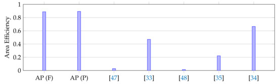 One can put a single multiplier and adder and claim the invention of the smallest FFT processor. Therefore, the smallest area cannot be the sole claim. For this reason, while reporting the results, the GSample/s per area () are provided. Figure 9 proves the overall claim of the study which is proposing an ultra-area-efficient FFT processor. According to the figure, the proposed processors shows the best area efficiency in terms of GSample/s/area when compared with the other processors. In other words, the in-memory FFT processors exhibit the best FFT performance per unit area. The recent study in [34] claims the better normalized throughput per unit area than the state-of-the-art available designs. Beyond this study, the proposed design accomplishes a 33.2% improvement over their reported results.