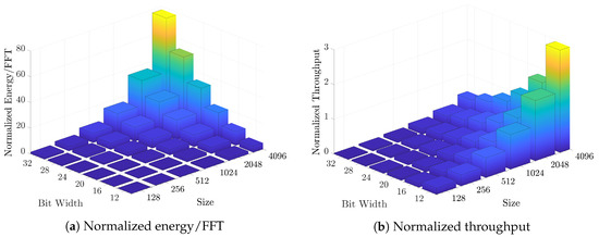 For a further inspection on the designed architecture, a design space exploration is performed on the architecture with different operand bit widths (12-32 bits) and FFT sizes (128-4K). Figure 10 shows the energy/FFT and throughput results of the area-efficient FFT processors (feedbacked) normalized to 12-bit 1K-point FFT proposed above. Since proposed architecture performs the operations as bitwise, both throughput and energy are highly correlated with it, therefore decreases as bitwidth increases. On the other hand, if the FFT data can fit inside the memory, the throughput of a single butterfly stage increases as . Overall, FFT throughput depends on the total number of stages as well which is formulated as . In overall, the normalized throughput with respect to FFT size changes by . In traditional FFT architectures, the throughput of a single butterfly stage decreases as FFT size increases since it needs to use the available resources sequentially, therefore, overall throughput changes by . Figure 11 shows the energy/FFT results for both the proposed FFT and the architectures from [48,49] where the FFT size changes between 128–2048 points. The architectures in [48,49] can be configured to perform 128, 256, 512, 1024, or 2048-point FFTs. The result demonstrates that proposed AP-based FFT shows better scaling in terms of energy/FFT with respect to increasing FFT sizes. Since the need for higher point FFT increases in the domains such as MRI which also requires parallel computation on the data coming from many receivers [50], the in-memory FFT architecture can propose an efficient solution together with the high-speed data placement through the proposed shift register-based approach.