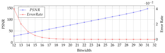 Bitwidth vs. average PSNR and error rate of 1024-point FFT.