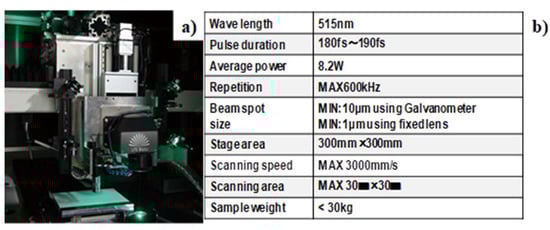 A femtosecond laser machining system is employed for physical modification of metallic and ceramic surfaces with use of LIPSS. Figure 1a depicts the femtosecond laser machining system in the present study.