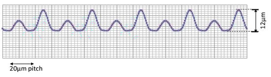 In correspondence to the superposition of nanotextures onto the micro-textures in Figure 3, high frequency peaks are detected on the main profile of microtextures. The maximum height reached to 13 μm, a little higher than Hmax = 12 μm in design. The spatial pitches in Figure 4 is equal to the designed data in Figure 2. That is, the tailored micro-/nano-pattern in computer-aided design (CAD) is reproduced as an actual micro-/nano-textured surface on the AISI304.