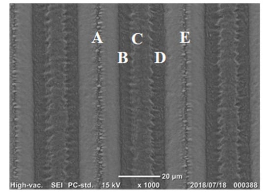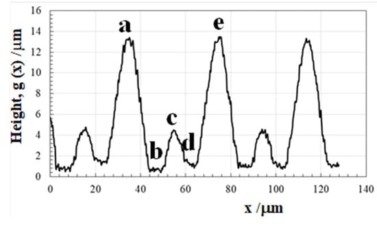The cross-sectional textured surface profile was data-processed from this two-dimensional SEM image to provide for further data processing and to estimate the fractal dimension (D) of this micro-/nano-texture formed by femtosecond laser machining. Figure 4 shows the one-dimensional surface profile selected in the lateral direction from the two-dimensional image in Figure 3. A single spatial texture a→b→c→d→e in Figure 4 just corresponds to A→B→C→D→E in Figure 3.