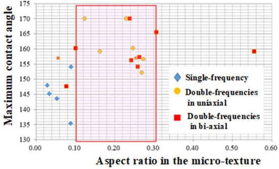 In the range of aspect ratio from 0.10 to 0.30, almost all the measured contact angles become higher than 150°; the surfaces in this range are super-hydrophobic. This proves that the micro-/nano-texturing changes the original hydrophilic surface to a super-hydrophobic one with a higher contact angel than 150° irrespective of the aspect ratio, but, that this aspect ratio becomes a key to improve this super-hydrophobicity with the contact angle toward 170° as well as the repellency of pure water.