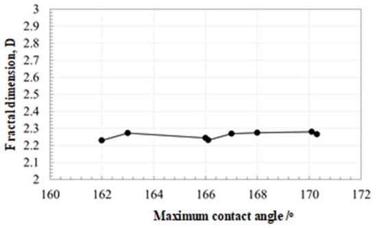 First, the variation of measured contact angle with the fractal dimension is studied in Figure 7. In the transient state from hydrophobic to super-hydrophobic states, the fractal dimension becomes nearly constant by D = 2.26. After this [18], most of the hydrophobic surfaces with a higher contact angle than 100° have the fractal dimension of 2.16 < D< 2.29. This implies that every micro-/nano-texture with a higher contact angle than 160° has the same self-similarity as defined in each material system and that D has little impact to increase the contact angle.
