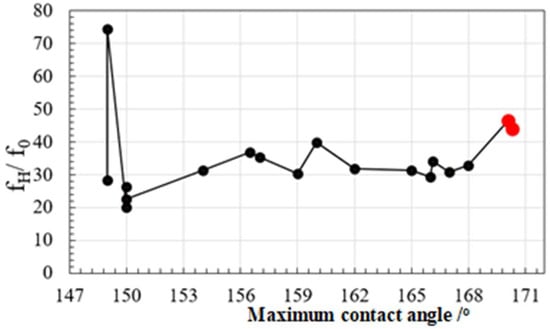 Relationship between the fH/f0 ratio and the maximum static contact angle. The red dots represent the highest contact angles by synthesizing the multi-frequency textures in Figure 2.