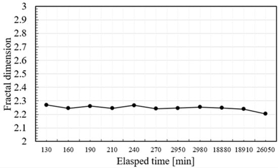 The exposure test was performed to investigate the geometric profile change of super-hydrophobic surface formed by the present method with the exposure time. The test-piece was exposed to air in atmospheric condition with the average humidity of 40%. An SEM image was taken at the specified time after air-blowing the surface for measurement of the fractal dimension. The contact angle was measured at the beginning and ending of test; e.g., θ = 170.2° at t = 0 and θ = 168.5° at t = 26,050 s. Figure 9 depicts the variation of the fractal dimension with exposure time. The measured fractal dimension is held to be nearly constant by 2.25 for 20,000 minutes or 330 hours. This proves that the super-hydrophobic AISI304 surface has sufficient durability after long-term usage with exposure to air in an atmospheric condition.