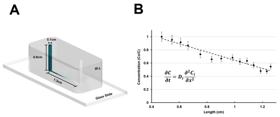 The gLL consists of two cylindrical reservoirs of 1 mm in diameter, 0.8 cm in height, and 6.3 µL volume each, both connected by a microchannel that is 1.3 cm in length (ℓc), 180.75 ± 4.71 µm in height, and 207.25 ± 6.57 µm in width, which is the equivalent of 193.1 µm in hydraulic diameter (Dh) [46], as per Figure 2A. Reagents are inserted into one reservoir and transport occurs along the microchannel toward the opposite reservoir via one-dimensional diffusion, defined by Fick’s Law: