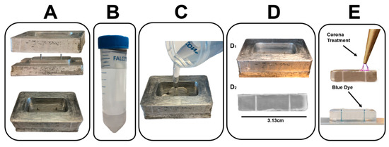 Key steps in the fabrication of the gLL system. (A) A desired pattern is machined into an aluminum mold via conventional computer-numerical controlled (CNC) machining. (B) A polydimethylsiloxane (PDMS) mixture is prepared using a 9:1 ratio of elastomer base to curing agent (weight per volume). (C) The PDMS mixture is poured into the machined mold of the gLL to reach the height of machined rods. (D) gLL casting using soft lithography techniques. (D1) PDMS is cured in a convection oven. (D2) Image of gLL cast from mold. (E) Corona treatment applied to gLL bonded to a glass slide. The gLL device was filled with blue dye to highlight its fluidic chambers, reservoirs, and microchannel.
