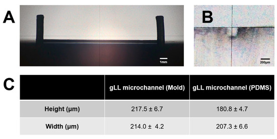 Profile projection of the gLL mold and the PDMS device cast. (A) Projection of the gLL mold. The grid is part of the highly precise software used to measure the height and width of the mold. (B) Cross-sectional area of the gLL system highlighting the microchannel. (C) Average measurements for both the aluminum mold and PDMS microchannel height and width.