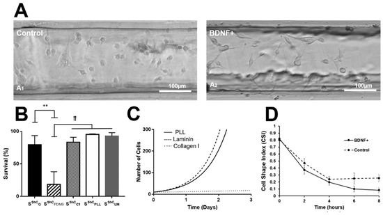 Experiments of this study examined cellular adhesion and migration on various substrates. gLL systems were functionalized with different extracellular matrices (ECM): (i) PLL: 15 µg/mL of Poly-L-Lysine (Cat. No. 25988-63-0, Sigma-Aldrich, St. Louis, MO, USA) diluted in DPBS; (ii) LM: 15 µg/mL of Laminin (Cat. No. 23017015, Life Technologies Corporation, IL) diluted in DPBS; and (iii) CL1: 10 µg/mL of Collagen type I (Cat. No. 9007-4-5, Sigma Aldrich, GA) diluted in 0.1% acetic acid (BD Biosciences, Bedford, MA, USA). In addition, cell migration was measured in response to external environments of different neurotrophic factors: (i) EGF: 100 ng/mL of epidermal growth factor (Cat. No. SRP3196, Sigma Aldrich); (ii) VEGF: 100 ng/mL of vascular endothelial growth factor (Cat. No. SRP3182, Sigma Aldrich); (iii) and BDNF: 100 ng/mL of brain-derived neurotrophic factor (Cat. No. 248-BD-005, R&D Systems, Minneapolis, MN, USA).