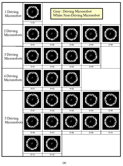 All combinations of driving microrobots and non-driving microrobots surrounding the pipe with 10 microrobots are shown in Figure 12a,b.