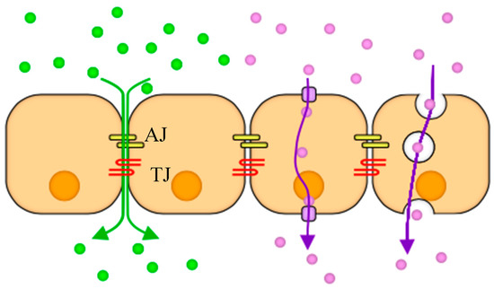 A schematic illustrating two cellular transport mechanisms: Paracellular (green) occurs as molecules diffuse through adherens (AJ) and tight junctions (TJ) between cells because of concentration gradient, and transcellular (purple) takes place when cells uptake and release molecules through their bodies via transport proteins or as vesicles.