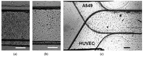 A549 and HUVEC cell monolayers as well as A549/HUVEC bilayers were successfully cultured in microfluidic devices as shown by the bright-field images in Figure 3a–c. Since it is difficult to distinguish between different cell types in bright-field images of bilayers cultured on opposite surfaces of a membrane, live cell staining was performed within a microfluidic device to confirm successful establishment of an A549/HUVEC cell co-culture.