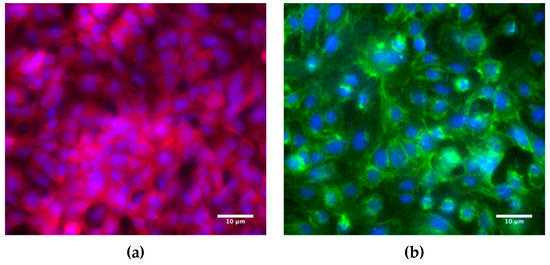 Cell layer confluency is typically verified via staining particular proteins involved in cell–cell adhesion. Previous work has suggested that A549 form tighter barriers with the presence of intercellular junction proteins [44,45]. Tight junctions comprise transmembrane proteins (occludin, claudins, JAM), cytoplasmic attachment proteins (ZO-1, ZO-2, ZO-3), and cytoskeleton protein F-actin [46]. The ZO-1 cytoplasmic protein was selected for staining as a biomarker for tight junctions in the A549 cells. The abundance of the red signal in Figure 4a, corresponding to the stained ZO-1 proteins (Proteintech, Rosemont, IL, USA), is evidence for the formation of tight junctions and confluency of the A549 cell monolayer. Adherens junctions in endothelial cells are mainly composed of cadherins and catenins [47]. The vascular endothelial cadherin (VE-cadherin, Cell Signaling Technology, Beverly, MA, USA), a calcium-dependent cell–cell adhesion transmembrane glycoprotein, was selected for staining as a biomarker for adherens junctions in the HUVEC cells. The green signal in Figure 4b, corresponding to the stained VE-cadherins, demonstrates the formation of Adherens junctions and confluency of the HUVEC cell monolayer.