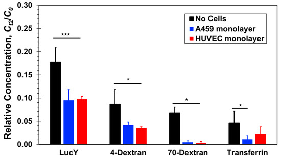 The measured relative concentrations of three paracellular-transport markers, Lucifer yellow, 4-dextran, and 70-dextran, and one transcellular-transport marker, transferrin, are compared in Figure 5 with and without confluent cell monolayers. All relative concentrations measured at the bottom compartments are smaller than the equilibrium concentration, Ct2 = C(t = 2 h) < 0.25C0, indicating that the diffusion process is still ongoing after the two-hours incubation time. Without cells, black columns, the relative concentration decreases with increasing molecular size. Based on the Stokes–Einstein equation, molecular diffusivity depends on its size as follows [48,49]: