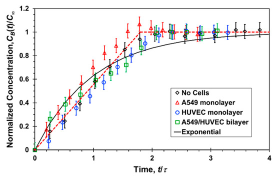 The temporal measurements of Lucifer yellow concentrations at the bottom channel outlets of the microfluidic devices with and without cells, under a flow rate of 20 µL/h, are summarized in Figure 6. The measured concentrations are normalized by the steady-state concentration, C∞ = 0.2C0, and a characteristic time scale of τ = 25 min. In all cases, the system had reached a steady state within one hour. More importantly, the collapse of the data indicates that the bottom-channel concentration increase with time, CB(t), in the absence of cells is very much the same as in the presence of cells, either an A549 or HUVEC monolayer or an A549/HUVEC bilayer. Thus, within experimental error, each of the three cell-culture combinations has negligible effect on the transport rate of Lucifer yellow molecules from the top to the bottom channel. In contrast, in the transwell static experiments, the concentration at the bottom compartment with cells was found to be about half of that with no cells, and is discussed next.