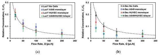 The flow rate, Q, is the most dominant parameter controlling the molecular transport rate between the two channels as it can vary from a very low rate resulting in complete mixing of the two streams, i.e., C∞→C0/2 as Q→0, to a flow rate high enough to render cross-membrane diffusion negligible such that C∞→0 as Q→∞. Therefore, the average molecular concentration at the bottom channel outlet was measured under different flow rates once steady state concentration distributions had been established within the microfluidic devices. The relative concentrations of the four molecules, C∞/C0, in the absence and presence of cell cultures are detailed in Figure 7 as a function of the flow rate. In general, in all cases with and without cells, the concentration is roughly inversely proportional to the flow rate decreasing with increasing flow rate. Under high flow rate, Q > 100 µL/h, the measured concentrations are so low such that it is very difficult to elucidate the effect of the cell cultures on the ensuing molecular transport because of the large experimental error. Phase contrast imaging revealed no changes in the confluence or morphology of monolayers cultured under the tested flow rate range, Q = 30–200 µL/h.
