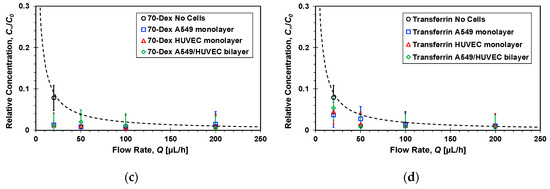 Flow rate effect on the steady-state relative concentrations of: (a) Lucifer yellow, (b) 4-dextran, (c) 70-dextran, and (d) transferrin markers measured at the bottom channel outlets of microfluidic devices, because of molecular transport from top to bottom channel, with and without confluent cell mono/bilayers; dash lines are functions inversely proportional to the flow rate fitted to the no cell experimental data with R2 = 0.9.