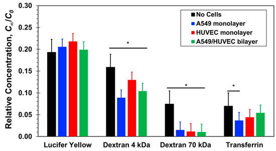 Fluorescently labeled tracer molecules commonly used in permeability studies were chosen as biomarkers for paracellular and transcellular transport. Lucifer yellow (0.44 kDa; Invitrogen, Carlsbad, CA, USA) has previously been used as a small molecule paracellular transport marker [31,37]. However, it should also be noted that a growing body of literature suggests that transcellular passage of Lucifer yellow may also occur via organic anion transporters [38]. Dextrans, non-digestible sugars, were selected to represent typical agents that are transported via the paracellular route through cell tight junctions [27,39]. Expression by epithelial or endothelial cells of membrane receptors mediating transcytosis of dextran has not been reported thus far; however, pinocytosis of dextran was observed [40], in which molecules are captured in vesicles on one side of the cell, drawn across the cell, and ejected on the other side. Since pinocytosis is a very slow process, transcellular transport of dextran is negligible compared to its paracellular transport [41]. To explore potential molecular-size effect, 4-dextran (4 kDa) and 70-dextran (70 kDa) (Invitrogen, Carlsbad, CA, USA) were chosen to represent the intermediate and large-size agents, respectively. FITC-transferrin (78 kDa; Rockland Antibodies, Limerick, PA, USA) was used to represent a typical protein that is transported via the transcellular route, transcytosis, where epithelial A549 and endothelial HUVEC cells uptake the molecules by binding transferrin to its membrane receptor expressed by both cell lines [31,39,42,43]. FITC-transferrin and 70-dextran molecules are about the same in size and, therefore, may share similar paracellular transport level.