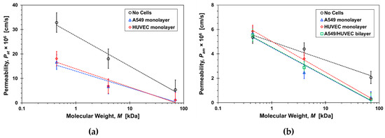 Ct2 is the measured concentration at the bottom compartment with a volume of V = 1500 µL following diffusion time of t = 2 h. The permeability values estimated based on Equations (6) and (7) in the range of 10−6–10−5 cm/s are in close agreement with previously published data [12,23,27,31]. The molecular size effect on the permeability, mainly because of paracellular transport, is demonstrated in Figure 9. The estimated permeability in transwells after two hours of diffusion (Figure 9a) and in microfluidic devices at steady-state under a 20 µL/h flow rate (Figure 9b) are plotted as a function of the molecular weight. The separation membrane permeability—without cells—is inversely proportional to the molecular size because of decreasing diffusivity with increasing size. The barrier permeability—with cell monolayers cultured on the separation membrane—decreases roughly logarithmically with increasing molecular size within experimental error. In static transwells, with no shear stress, the permeabilities of all three paracellular markers with a confluent A549 or HUVEC cell monolayer are markedly smaller than without cells; no clear difference between the epithelial- and the endothelial-monolayer permeability can be discerned. The trends in microfluidic devices with shear stress are similar to those in transwells, except for the Lucifer yellow permeability in microfluidic devices which is about the same with and without the cell layers. The permeability of the 70-dextran is close to zero in both systems. Since its transcellular transport is negligible, its paracellular transport through the cell TJs is also negligible because of its large size. Transcellular transport of 4-dextran is assumed to be negligible, similar to 70-dextran, independent of dextran molecular size. Therefore, because of its smaller size, the 4-dextran permeability in both transwells and microfluidic devices is likely due to paracellular transport through leaky TJs.