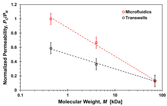 The effect of shear stress on permeability can be delineated from comparing the transwells with the microfluidic results. However, the microfluidic permeability was estimated under steady molecular flux independent of time, while the molecular flux in transwells is time-dependent decreasing gradually from its maximum at the start of the diffusion process to zero at equilibrium when the concentrations at the top and bottom compartments are the same. Therefore, a direct comparison between the permeability results obtained in transwells and microfluidic devices is not appropriate. Instead, it is more appropriate to compare normalized permeability results for each system. The ratio between the permeability with and without cell layers in transwells and microfluidic devices, PC/PN, is shown in Figure 10 as a function of molecular size. The trends in both systems are similar as the permeability ratio decreases with increasing molecular size indicating that the paracellular transport is adversely affected as the size of the molecules increases. However, the microfluidics slope is significantly higher than the transwells slope highlighting the additional effect of shear stress. The results suggest that the paracellular-transport dependence on molecular size can be regulated to a certain degree by applying shear stress. Indeed, it is known that TJs form regulated, selectively permeable barriers between two distinct compartments. TJs do not just represent static structural elements but they are dynamically regulated to control paracellular solute and ion transport in diverse physiologic states [53].