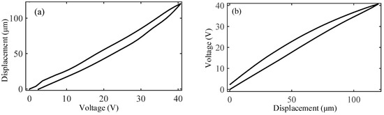 It can be observed that the width of the hysteresis is wider for a higher input voltage amplitude, differing enormously from the ideal linear output of PZT. To evaluate the hysteresis error, the maximum hysteresis error is defined as the ratio of the maximum distance at the same voltage value on the hysteresis loop to the maximum displacement value on the hysteresis loop, which is 12.83% and can be expressed as: