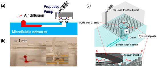 Highly demanded features in point-of-care testing are autonomy, compactness, and the absence of an external pumping force. In a laboratory setting, manual injection pumps are widely used for microfluidics due to their simplicity. However, manual direct injection is not suitable for devices that require constant and controllable flow rates. Among the various injection methods, the passive pumping method [1,2,3,4,5,6,7,8,9,10,11,12,13,14,15,16] and, especially, the capillary pumping method [5,6,7,8] are widely studied for point-of-care testing for achieving a hand-held lab on a chip-type device. Juncker et al. [5] demonstrated autonomous transportation aliquots of different liquids in sequence using the capillary system. However, the performance of a capillary pumping system depends on surface conditions, fjor example, stable surface conditions are required to achieve constant and controllable flow rates. Recently, a vacuum-assisted pumping method has been introduced. Hosokawa et al. [3,4] demonstrated sample liquid driving methods by using the gas solubility of polydimethylsiloxane (PDMS), where the device was pre-degassed before the operation. However, due to the reabsorption of air once the device was exposed to air, the flow rate decayed immediately. In our previous study [9,10,11,12], a syringe-assisted pumping method which utilized the gas permeability of polydimethylsiloxane was introduced. The pump can drive the liquid without external pumps, however, there are inherent drawbacks. First, the flow rate was significantly reduced after the flow enters the part of channel surrounded by a vacuum chamber. This occurs because the air diffusion area decreases while the fluid approaches the dead-end channel surrounded by the vacuum chamber, resulting in a non-constant flow rate. Achieving a stable flow rate using the passive pumps has been widely studied over the years. Secondly, a pump integrated on the same layer with a fluidic channel, as in the previous reported syringe-assisted pumps [10], is a drawback. The pump height needs to be identical to the fluidic channel unless the users decide to make complicated multiple layers. As the geometry of pump is one of the major design factors for achieving the designated flow rates, the previous reported pump can be limited in controlling flow rates. With the adjustable height design in the proposed pump, the increasing flow rate can be achieved. In addition, it is noteworthy that the proposed pump is designed to be a compact pump, which allows the researchers to operate their designed microfluidic devices just by attaching the pump. In this paper, we propose a compact syringe-assisted vacuum-driven pump with a constant and increasing flow rate for integrated microfluidic networks.