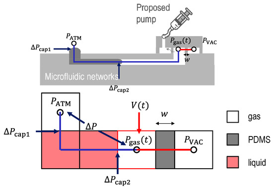 The pressure change inside the microfluidic channel can be described using ideal gas laws. An equivalent pressure model is shown in Figure 2.