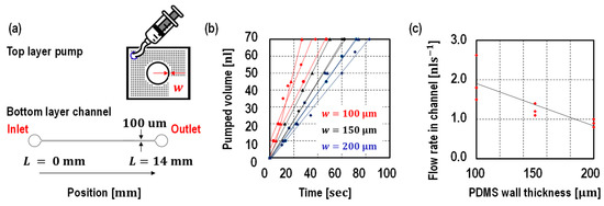 (a) Device schematic and (b) its measured pumped volume over the time, (c) the flow rates against the wall thickness. The PDMS wall thickness were designed to be 100 μm, 150 μm, and 200 μm. The flow time is measured corresponding to the liquid position. As shown in the graph, the pump provided a constant flow rate despite liquid position. The flow rate is inverted proportional to the PDMS wall thickness. All of the devices were tested at least three times.
