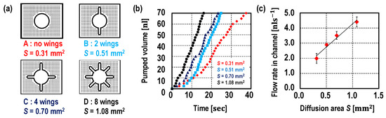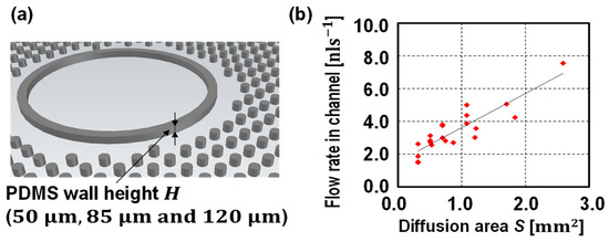 (a) One of the controlling diffusion area approaches and (b) flow rates against the diffusion area plot. The PDMS wall thickness was set at 100 μm, however, by adjusting the height of the PDMS wall (50 μm, 85 μm, and 120 μm), the diffusion areas were adjusted. Under these design conditions, the flow rates were proportional to the diffusion areas as described in Equation (1).