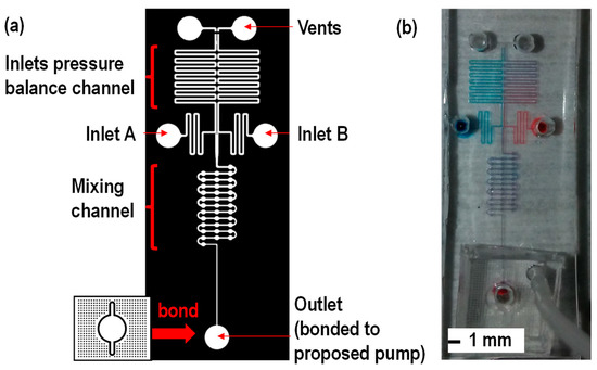 (a) Micromixing device channel design adopted from [12] and (b) experimental results. As one of the advantages of using the proposed device is that the proposed pump can be used for the operation of the device designed by [12]. In the test channel design [12], the micromixing channel design consists of two inlets, an inlet pressure balance channel for offsetting the pressure difference at inlets, the micromixing channel and the dead-end channel connected to the proposed pumping. The vent and the inlet pressure balancing channel were serving to offset the pressure difference between inlets A and B to avoid any backflow while sample mixing [12]. As shown in (b), micromixing of two samples was achieved with the proposed pump.