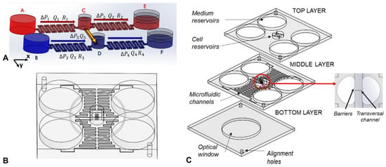 The device layout is shown in Figure 1A,B. It was composed of three layers of PMMA (80 cm long, 72 cm wide and 3 mm high) which were machined by micro-milling (Mini-Mill/Gx from MiniTech machinery corporation, Peachtree Corners, GA, USA) in order to reproduce, on the different layers, the reservoirs, the microfluidic channels, and two alignment holes. In particular, the top layer integrated part of the source and drain reservoirs used for the cell media (3 cm in diameter) and central reservoirs used for the cell samples (which had a half-circular shape of 1 cm in diameter) and two alignment holes (3 mm in diameter). The middle layer integrated part of the media reservoirs and sample reservoirs, four microfluidic channels (2 cm long, 185 μm wide and 140 μm high) connecting the media reservoirs with the sample reservoirs, and a transversal micro channel (2 mm long, 185 μm wide and 140 μm high) connecting the sample reservoirs in which the concentration gradient would be formed. At the inlet and outlet of the transversal microchannel, a barrier was integrated to prevent the cells from being washed away by the flows. The bottom layer integrated the optical window (40 mm in diameter) and two alignment holes (3 mm in diameter). The three PMMA layers were bonded together by solvent assisted bonding. During this process, the three layers of PMMA were placed in ethanol for 1 h and 20 min, were then aligned by using the alignment holes and pressed together at 1.5 kN at a temperature of 45 °C for 1 h in a heat press (PO Weber®, Remshalden, Germany) []. Before carrying out the experiments, the device was treated with a 10% aqueous solution of PEG (polyethylene glycol) dissolved at 30 °C, to improve its wettability. The solution is introduced into the channels by a syringe with suction cup and was then evaporated with nitrogen flow.