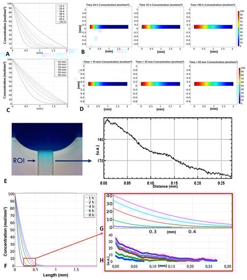 (A,B) Simulation of the food dye concentration gradient: the concentration gradient of the dye within the transversal channel is linear only after 192 h, due to the low value of the diffusion constant; (C,D) simulation of the interleukin-8 (IL-8) concentration gradient: unlike the food dye, the concentration gradient of the interleukins becomes linear after almost 60 min; (E) the concentration values were calculated according to the pixel intensity of images taken in time-lapse along the transversal channel and are therefore expressed in arbitrary units, we report the pixel intensity as a function of the distance 8 h after having filled the device with the blue dye; (F) gradients of concentration of the food dye as a function of the channel position at different times; (G) simulated trend of the concentration gradient within the transverse channel, values expressed in mol/m3; (H) real trend of the concentration gradient.