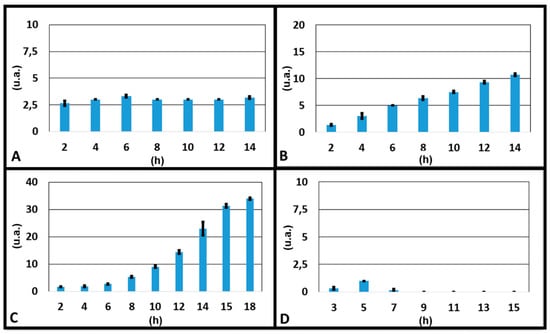 The simulations reflect the expected theoretical behaviour of the two species: as we know, in fact, the diffusion time is proportional to the size of the molecule that spreads. As we can see in Figure 4A,B, after 12 h a gradient could be observed in the first 0.5 mm of the transversal channel and a linear gradient throughout the entire length of the channel could be observed after almost 200 h. This long time was due to the value of the diffusion constant chosen equal to 1 × 10−12 m2/s, according to the ingredients of the food dye (mainly complex carbohydrates). Usually diffusion velocities of small proteins, sugars, or other biomolecules used in chemotaxis studies are 100 times higher than the one considered and this means that a linear gradient is formed in few hours, as it can be seen in Figure 4C,D.