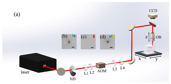 (a) Schematic of the experimental setup. ND, variable neutral density filter; L1 and L4, convex lens; L2 and L3, concave lens; AOM, acousto-optical modulators; CCD, charge-coupled device; OB, objective lens. Cross-sectional view of optical micrographs of lines inscribed in fused silica with (b) positively chirped 10 ps laser pulses, (c) transform-limited 190 fs laser pulses, and (d) negatively chirped 10 ps laser pulses. Scale bar: 25 μm.
