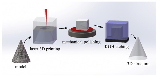 After the fused silica samples were selectively irradiated by the focused laser pulses, the samples were polished to remove the outer areas as illustrated in the first three panels of Figure 2. The outer areas near the vertical sidewalls of the cubic sample could not be sufficiently modified by the laser irradiation because of the distortion of the focal spot caused by the air–glass interface at the sidewalls. The polished samples were then immersed in a wet-etching bath of potassium hydroxide (KOH) with a concentration of 10 mol/L at a temperature of 90 °C for tens of hours, as shown in the last two panels of Figure 2. For example, it took in total ~72 h (the etch rate was estimated to be 0.15 cm3/h) in the etching process to produce the 3.8 cm-tall Confucius sculpture, as will be shown below.