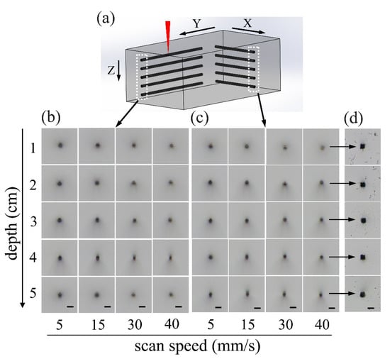 To examine the fabrication feature sizes, offered by loosely focusing the picosecond laser pulses into fused silica as a function of focal position along the propagation direction, we first inscribed multiple lines as schematically illustrated in Figure 3a. The lines, which are inscribed at different scan speeds and depths within fused silica, were organized into two grid arrays oriented in X and Y directions, as shown in Figure 3b,c, respectively. The scan speed and the depth of the focal position can be identified for each inscribed line, as indicated in Figure 3b,c. The average laser power was fixed at 1.65 W in the writing of the lines in both of the two arrays, corresponding to an intensity [20] of , and the laser pulses were always polarized along the Y direction. The results in Figure 3 were obtained using laser pulses negatively chirped to 10 ps. However, as shown in Figure 1, the same results can also be obtained if one chooses to use positively chirped pulses as long as the pulse duration is properly chosen.