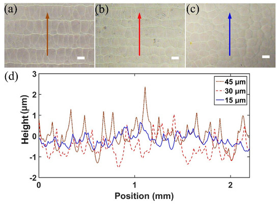 It is shown in Figure 3 that an isotropic feature size on the level of ~20 μm, which is independent of the depth of the focal position, can be obtained by loosely focusing the picosecond laser pulses into fused silica. However, for fabricating the 3D objects, chemical wet etching must be used, which leads to degradation of the fabrication resolution. To determine the limit on the fabrication resolution along the longitudinal direction, we scanned the focused picosecond laser pulses in the glass with different slice thicknesses and etched the samples in KOH to reveal the surface morphologies. As shown in Figure 4a–c, the surfaces produced with the slice thicknesses set at 45 μm and 30 μm show a clear laminar feature, owing to the fact that the thickness of each modification layer is less than both slice thicknesses. When the slice thickness is reduced to 15 μm, the laminar feature disappears, leaving behind a uniform surface with a typical morphology given rise to by the FLICE. It is also shown in the 1D surface profiles of the samples measured with a surface profiler, as shown in Figure 4d, that periodic ripples oriented along the horizontal direction, with a height between 1 μm and 2 μm and a height around 1 μm, appear for the surfaces produced at the slice thicknesses of 45 μm and 30 μm, which agrees well with the observations in Figure 4a,b. However, when the slice thickness is reduced to 15 μm, the 1D profile along the cutting lines in Figure 4d only shows random peaks without a significant periodicity.