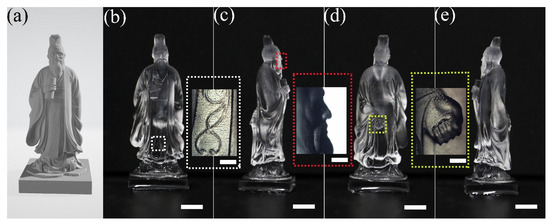 The optimum inscription condition determined in Figure 3 allows us to print macro-scale 3D objects at micro-scale feature sizes. Figure 5 shows a 3.8 cm high sculpture, which is a statue of Confucius. The model of the sculpture is shown in Figure 5a, and the printed sculpture is presented from different angles of view in Figure 5b–e in the order of (b) front, (c) left, (d) back, and (e) right sides. The details of the decorative pattern on the cloth, the right side of his face, and the left hand hanging behind his body are shown in the insets on the right-hand side of the images in Figure 5b–d, respectively. It proves that the entire sculpture is printed with a decent fabrication feature size from top to bottom. The surface of the whole sculpture appears smooth, although it does not reach the level of the mirror-like surface quality typically produced with mechanical polishing. Improvement on the surface quality is possible with elaborated post-annealing or CO2 laser polishing, which requires much effort to optimize and will be investigated in the future.