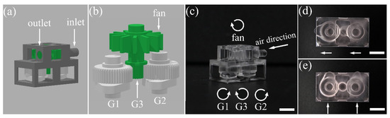 Besides, we demonstrated an air turbine with movable parts directly fabricated within glass without any assembling process. The model of the air turbine is illustrated in Figure 6a,b. As shown by Figure 6b, the micromachine is composed of an air fan, one driving gear and two driven gears, as well as two cams. The driving gear is fabricated with the turbine fan as an integral component to ensure a robust physical connection between the gear and the turbine fan. The two driven gears can be wound by the driving gear when airflow drives the fan to rotate. Each of the driven gears is connected with a cam. The laser printed air turbine is presented in Figure 6c. The micro-machine is functional as we can rotate the cams by injecting airflow from the inlet. The synchronized motion of the two cams is evidenced by the images in Figure 6d,e, in which the orientations of the cams are changed as indicated by the white arrows. Thanks to the capability of fabricating large objects at high resolution, the demonstrated technique offers potential for manufacturing precision instruments, tools and machines in various research and application fields.