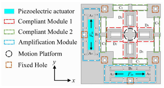 The compliant positioning stage, with a symmetrical design, is mainly composed of two bridge-type amplification mechanisms (Amplification Module), four double parallelogram mechanisms (Compliant Module 1), four compound parallelogram mechanisms (Compliant Module 2), and a motion platform, as shown in Figure 1. Based on the aforementioned discussion of the different actuators used in precision driving fields, PEAs were selected as the driving components and installed into the bridge-type amplification mechanisms.