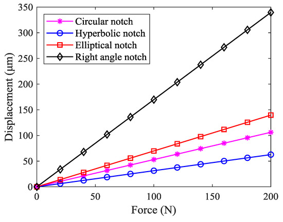 In the literature, various types of flexible hinges with different notches have been developed [35,36,37,38,39], including the commonly used circular notch type, hyperbolic notch type, elliptical notch type, and right angle notch type, as shown in Figure 2. In order to obtain the stiffness characteristics, the force-displacement relationship of four common flexure hinges was analyzed by ANSYS. It should be noted that the dimension parameters and material of each flexure hinge are the same in the finite element analysis. The results, as shown in Figure 3, indicate that the displacement of the right angle notch flexible hinge was the largest when an equivalent force was applied. The parallelogram mechanism constructed by flexible beams provided a larger linear deformation region than that constructed by flexible hinges and rigid beams [40]. In addition, it is easier to achieve higher accuracy when machining straight contours, rather than curved contours. For large motion stroke and ease of fabrication, the bridge-type amplification mechanism and parallelogram mechanism were constructed using right angle notch flexible hinges with lumped compliance and flexible beams with distributed compliance, respectively.