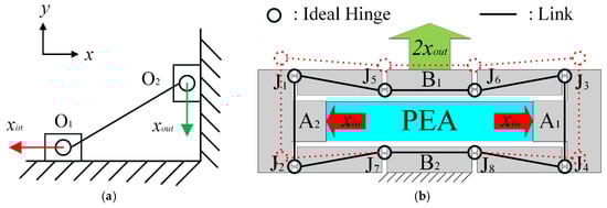 PRB model of the bridge-type amplification mechanism: (a) Working principle, and (b) overall scheme. (PRB model: pseudo-rigid-body model, PEA: piezoelectric actuator)
