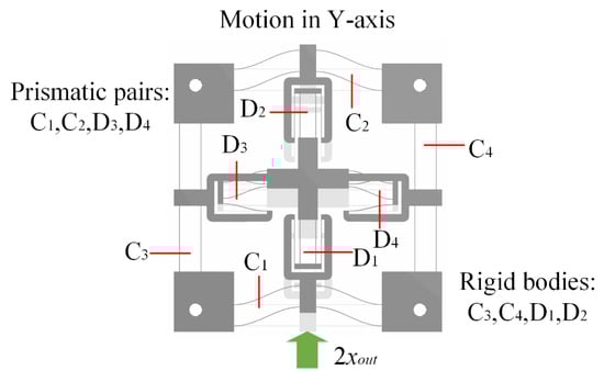 Due to the symmetry of the stage, only motion in the Y-axis of the stage is taken as an example to demonstrate the working principle. The working principle and PRB model of the bridge-type amplification mechanism are illustrated in Figure 4. As the bridge-type amplification mechanism is composed of four symmetrical branches, one of the branches is taken to present the working principle, and the equivalent model is shown in Figure 4a. When an input displacement xin is applied to the point O1 along the X-axis, a displacement xout along the Y-axis is generated at the point O2. As can be observed from Figure 4b, the motion state of the branch J2J7 is similar to that of O1O2. The only difference is that the point J7 is a fixed hinge, so point J2 moves the displacement of xout along the positive direction of Y-axis while moving along X-axis. Similarly, when point J1 moves along the negative direction of X-axis, the output displacement xout along the positive direction of Y-axis is generated at point J5. However, as point J2 raises the initial position of point J5 by xout, the actual output displacement of point J5 is 2xout. The output displacement of point J6 is the same as point J5, due to the symmetrical structure. It should be noted that the values of the displacement along X-axis are equal and the directions are opposite; therefore, link B1 only moves along the Y-axis. Thus, when the inputs A1 and A2 of the bridge-type amplification mechanism are driven by a force Fin along the X-axis, the input displacements xin will be applied in the positive and negative directions of the X-axis, respectively. Simultaneously, an output displacement of 2xout in the positive direction of the Y-axis will be produced at link B1. Due to the high axial stiffness and low transverse stiffness of flexible beams, the compound parallelogram mechanisms C1 and C2 and double parallelogram mechanisms D3 and D4 can be assumed to be prismatic pairs of the motion. While the compound parallelogram mechanisms C3 and C4 and double parallelogram mechanisms D1 and D2 can be assumed to be rigid bodies, the linear motion of the motion platform is finally achieved through motion transmission, as shown in Figure 5. The working principle is similar in the X-axis, but the prismatic pairs and rigid bodies are exchanged. Thus, 2-DOFs of motion (i.e., in the X and Y directions) are obtained. Double parallelogram mechanisms and compound parallelogram mechanisms with small cross-coupling error are adopted in the design, which can effectively attenuate the cross-coupling displacement.