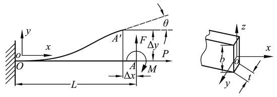 The double parallelogram mechanism and the compound parallelogram mechanism are both composed of flexible beams. In general, the flexible beam is in a state of large deflection and, so, the analysis of the flexible beam involves complicated non-linear factors. The models for the non-linear deflection of a beam are: The PRB model (including the improved PRB model, which can be utilized to analyze flexible beams with inflection points) [41,42,43], the Beam constraint model, the non-linear finite element method, and the elliptic integral method. When the transverse displacements of the flexible beam are as small as the thickness of the beam, the non-linearity caused by the force equilibrium conditions becomes significant, due to the load-stiffening and elastokinematic effects. While PRB models capture load-stiffening, their inherent lumped-compliance assumption precludes elastokinematic effects (for more details, see [44]). High calculation accuracy can be obtained by the non-linear finite element and ellipse integral methods, while a large number of nodes and complex integral calculation make such methods unfavorable for early design. In contrast, high precision with a simple calculation can be achieved using the beam constraint model when the beam deformation does not exceed 10% of the beam length, and this model is a general method which can calculate the deformation of flexible beams regardless of whether there are inflection points [45]. Therefore, the Beam constrained model was applied to model the flexible beams in this paper. As the parallelogram mechanisms are composed of flexible beams, a single flexible beam was first modeled. The structural parameters and deformation are shown in Figure 6, where F, P, and M are the lateral and axial forces and moment of the flexible beam, respectively, and b, t, and L are the width, thickness, and length of the flexible beam, respectively.