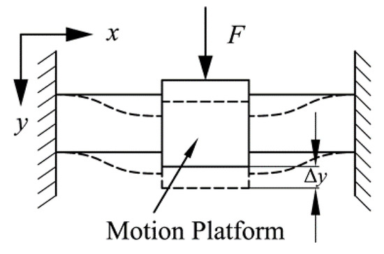 The deformation of the compound parallelogram mechanism is shown in Figure 8. Each flexible beam can be considered to be a fixed guiding beam (i.e., Δx = 0 and the tip deflection angle is θ = 0). Substituting Δx = 0 and θ = 0 into Equations (1) and (2), the relationship between force and displacement of a compound parallelogram mechanism can be derived as: