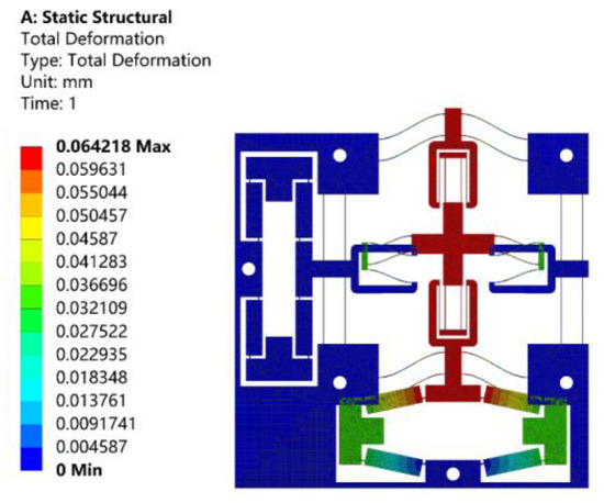 Static analysis was performed to verify the prediction of the deformation of the proposed stage, input and output stiffness, and displacement amplification ratio of the proposed theoretical model. When a total displacement of 10 μm was applied to the bridge-type amplification mechanism in the X-axis, the resulting motion of the stage in the Y-axis is shown in Figure 11. As can be observed from Figure 11, the displacement of the stage was 64.2 μm, and the amplification ratio was about 6.42. According to Equation (16), the theoretical amplification ratio was calculated as 6.57, and the relative error was 2.34%, compared to the finite element value.