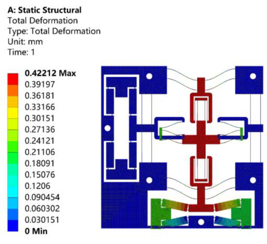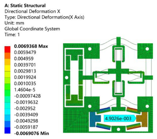 When a driving force of 10 N along the X-axis was, respectively, applied to the input ends of bridge-type amplification mechanism, the resulting displacements of the input ends are shown in Figure 12. As can be observed from Figure 12, the displacement of the input end along the X-axis positive direction was 4.9 μm, and the input stiffness was about 2.039 N/μm. The theoretical input stiffness calculated by Equation (32) was 2.118 N/μm, and the relative error was 3.87%.