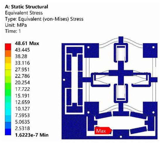 The adopted PEAs had an actual stroke of 65 μm. Therefore, the input displacement of 65 μm was applied to the bridge-type amplification mechanism along X-axis, and the resulting maximum stress is shown in Figure 14. As can be observed from Figure 14, the maximum stress of 48.61 MPa occurred at the surface of flexure hinge, which was far below the yield strength of Al7075.
