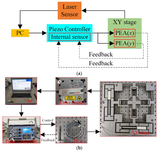 The experimental setup is established in Figure 17. A prototype of the stage was fabricated by the wire electrical discharge machining (WEDM) process with a piece of Al7075. Two PEAs (PSt150/7/80 VS12 from COREMORROW, Inc., Harbin, China), pre-tightened by an appropriate screw, were installed into the bridge-type amplification mechanisms to actuate the stage; the technical parameters of the PEA are listed in Table 4. A piezo controller (E01.D3 from COREMORROW, Inc., Harbin, China) which realized closed-loop control through the inside position sensor was utilized to drive the PEAs, and the influence of the hysteresis characteristics of PEA were almost eliminated. The output displacement and cross-coupling error of the stage were measured by a laser sensor (optoNCDT2300 from MICRO-EPSILON Messtechnik GmbH, Ortenburg, Germany) with a 2 mm measurement range and 30 nm resolution.
